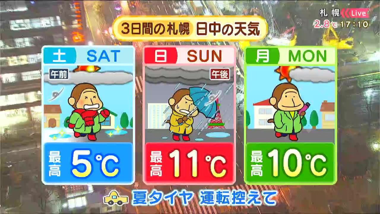 夏タイヤでの運転は控えましょう。あす8日(土)の午前中は雪、日曜の午後は雨。月曜も一時的に弱いミゾレが降るため、連日傘が必要です。