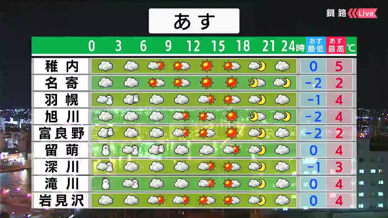 午前は札幌や留萌、網走などで雪が降るでしょう。午後は各地で日が差す見込みです。最低気温は0度前後、最高気温は5度くらいで寒さが続くでしょう。