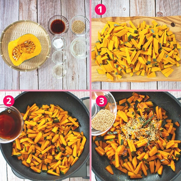 ① かぼちゃは種とわたを取り除き、幅5mmの拍子木切りにする。