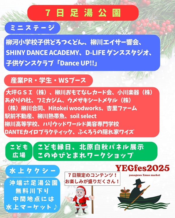 そして、お子さん連れのママ・パパには7日(日)が特におすすめ!足湯公園会場が「キッズスペース&サブステージ」に変身します。子どもたちが大好きな縁日やワークショップ、さらにはダンスなどのステージイベントも盛りだくさん。さらに嬉しいのが、メイン会場(沖端)と足湯公園をつなぐ「水上タクシー」に無料で乗れること!途中には水上マーケットもあるそうですよ♪