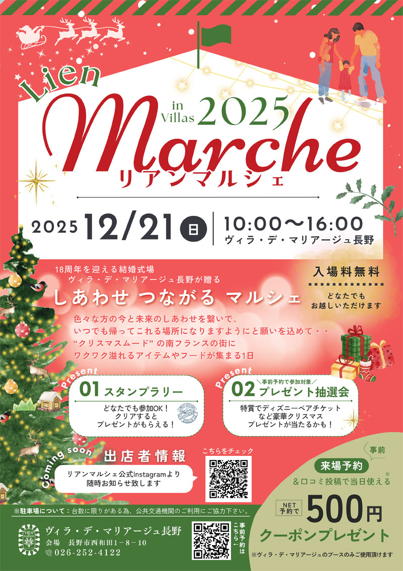 当日は誰でも参加できるスタンプラリーやプレゼント抽選会に加え、事前の来場予約&口コミ投稿限定で当日「ヴィラ・デ・マリアージュ長野」ブースで使える500円のクーポンプレゼント企画も用意されています。
