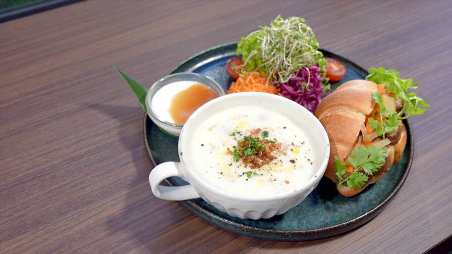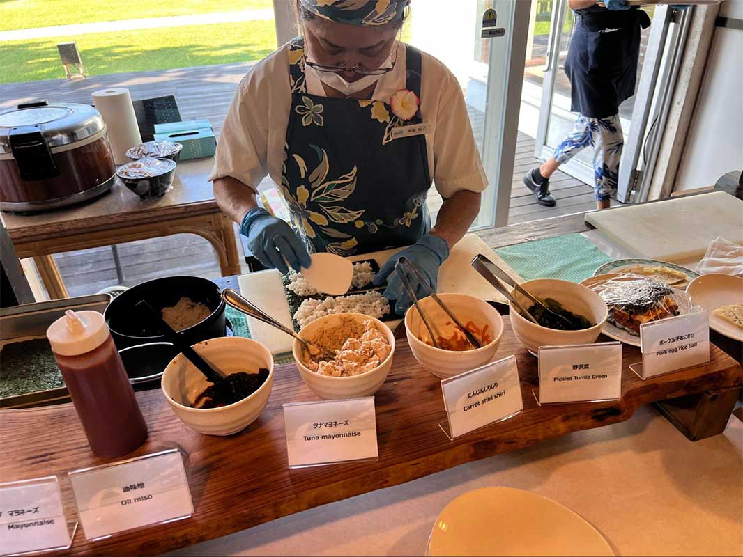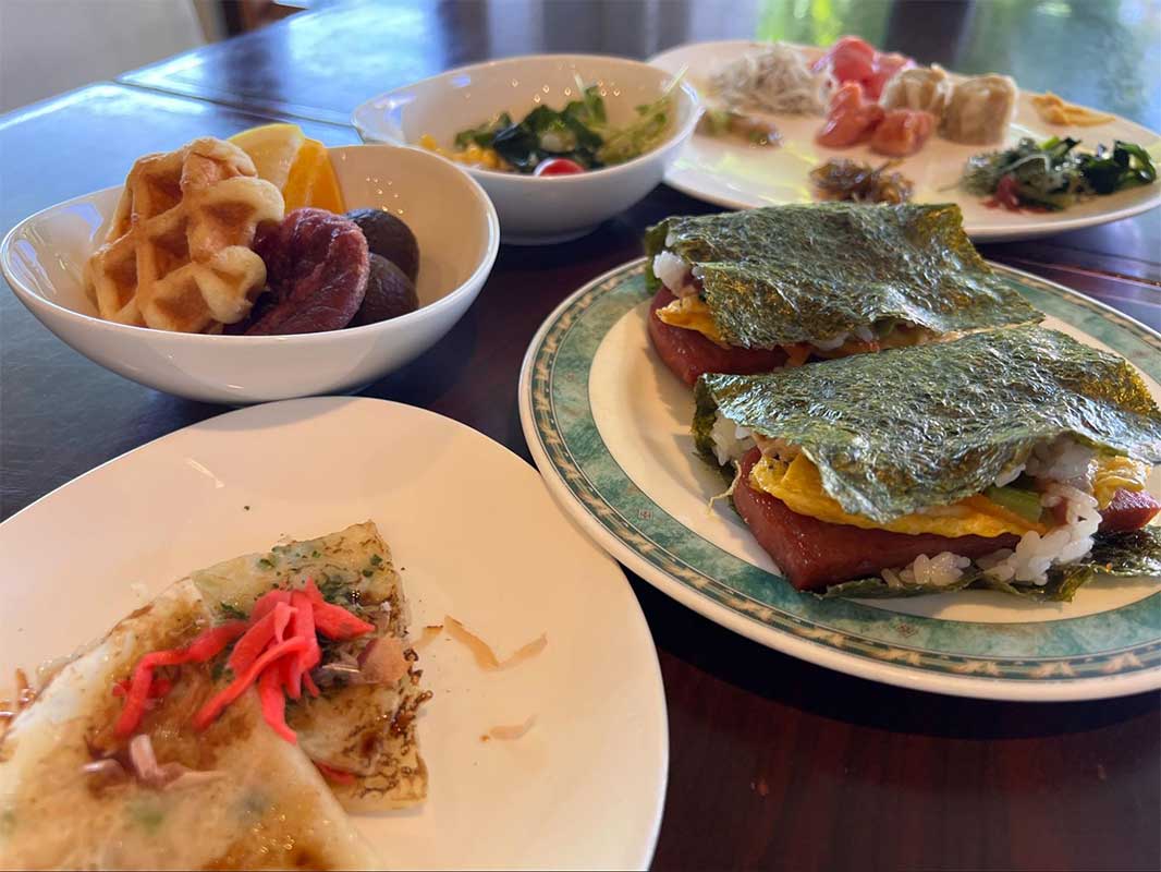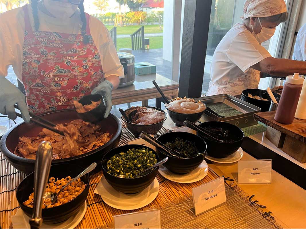 「SURF SIDE CAFE」では、沖縄そばやゴーヤーチャンプルー、ゆし豆腐などの郷土料理に加え、海鮮やご飯のお供、焼きたてパンなどがずらりと並びます。
