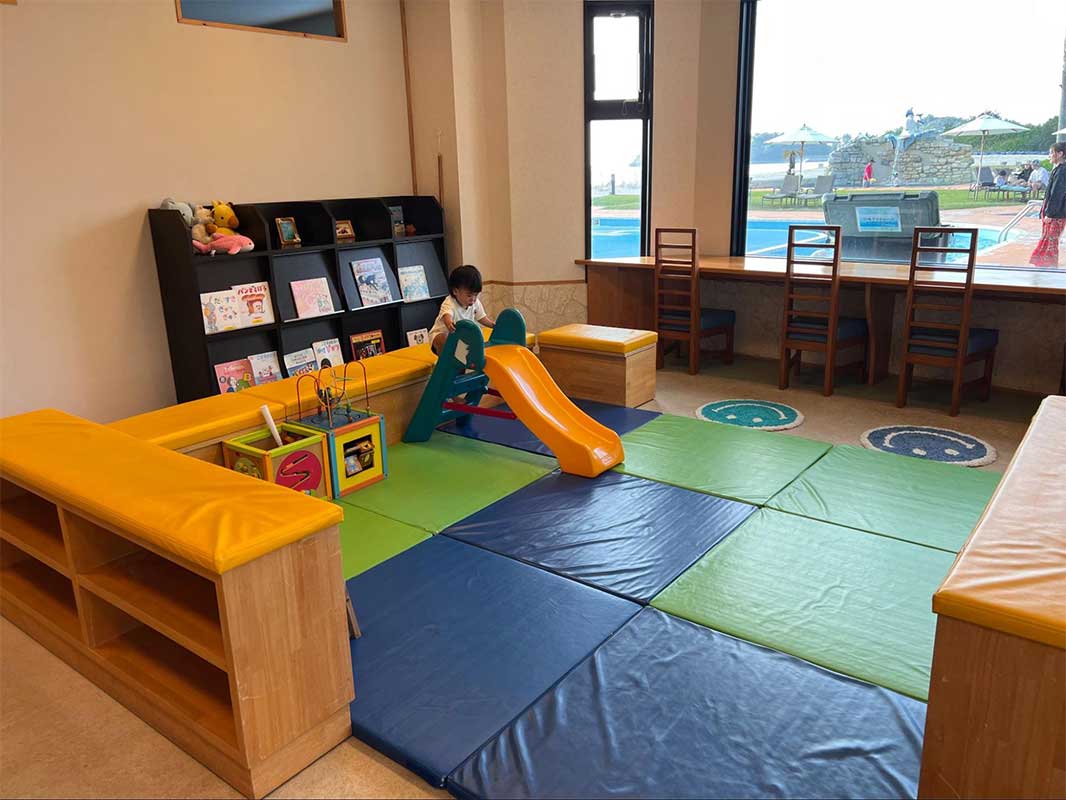 海とプールを楽しんだあとは、プール横のキッズスペースへ。絵本やおもちゃが揃っており、小さな子ども連れにとって嬉しい環境が整っています。