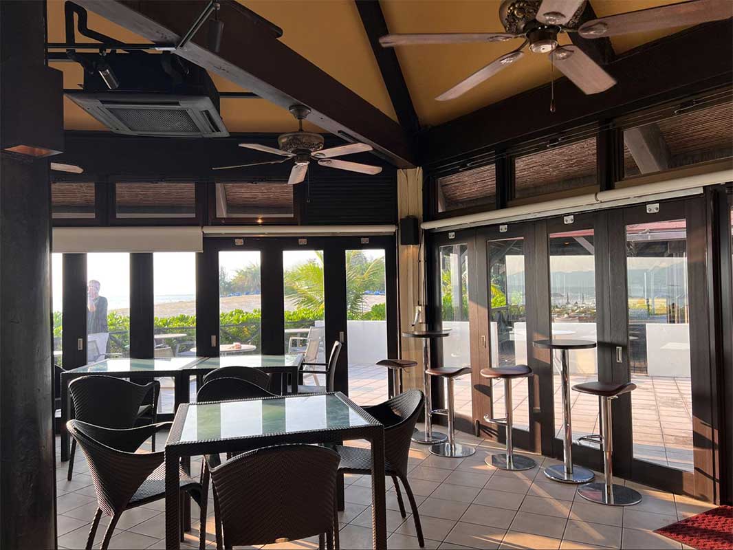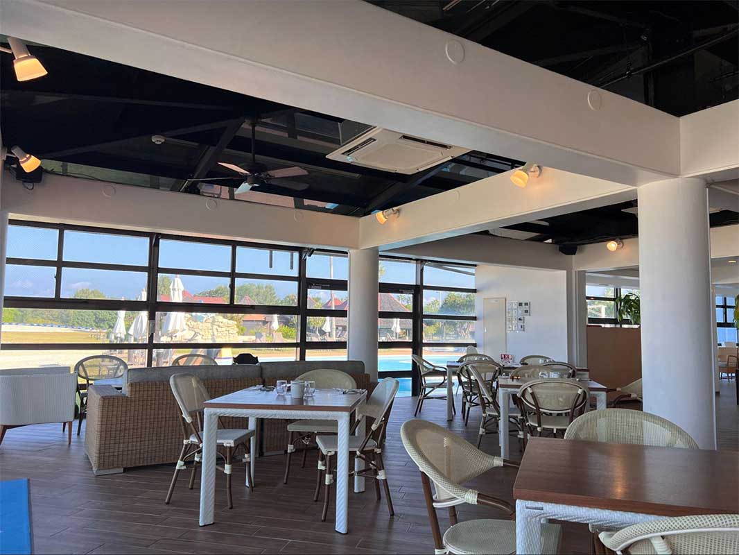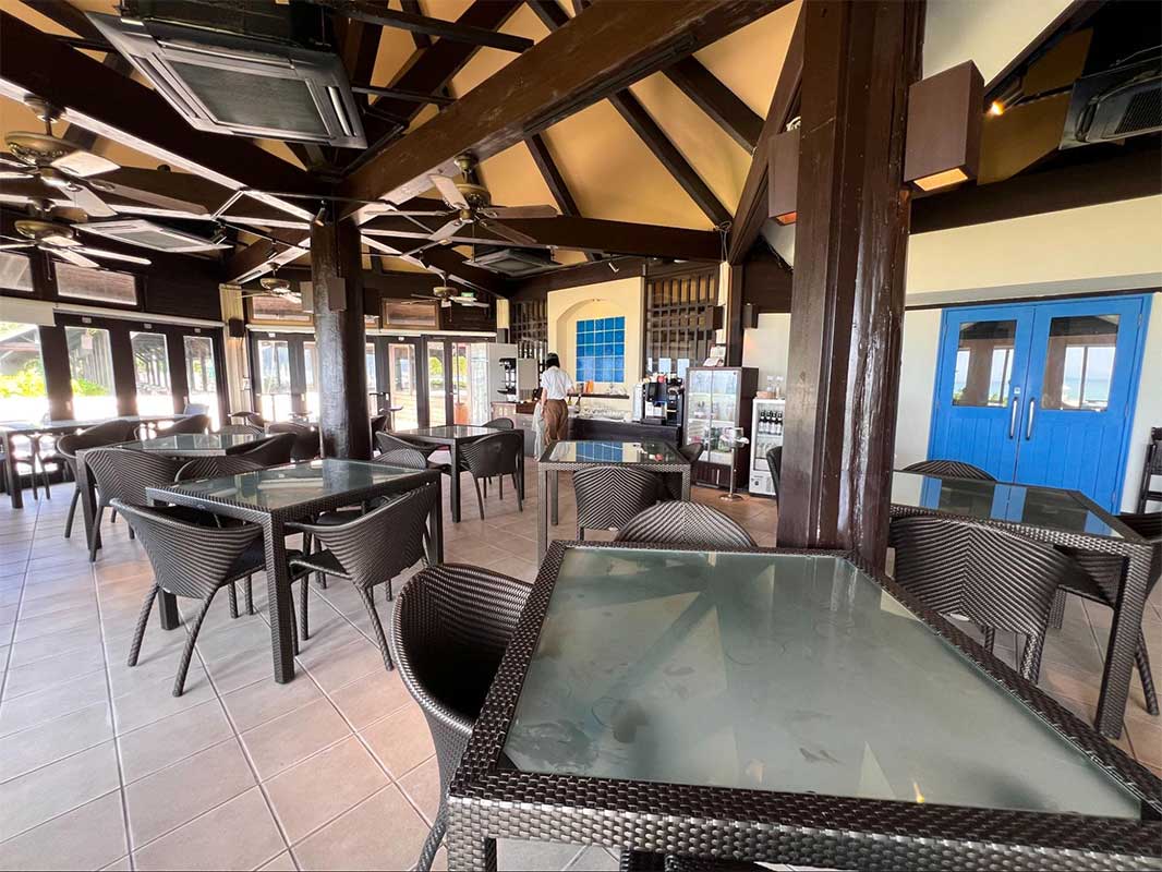 一面がガラス張りになった開放的な空間で、目の前には美しい海が広がります。