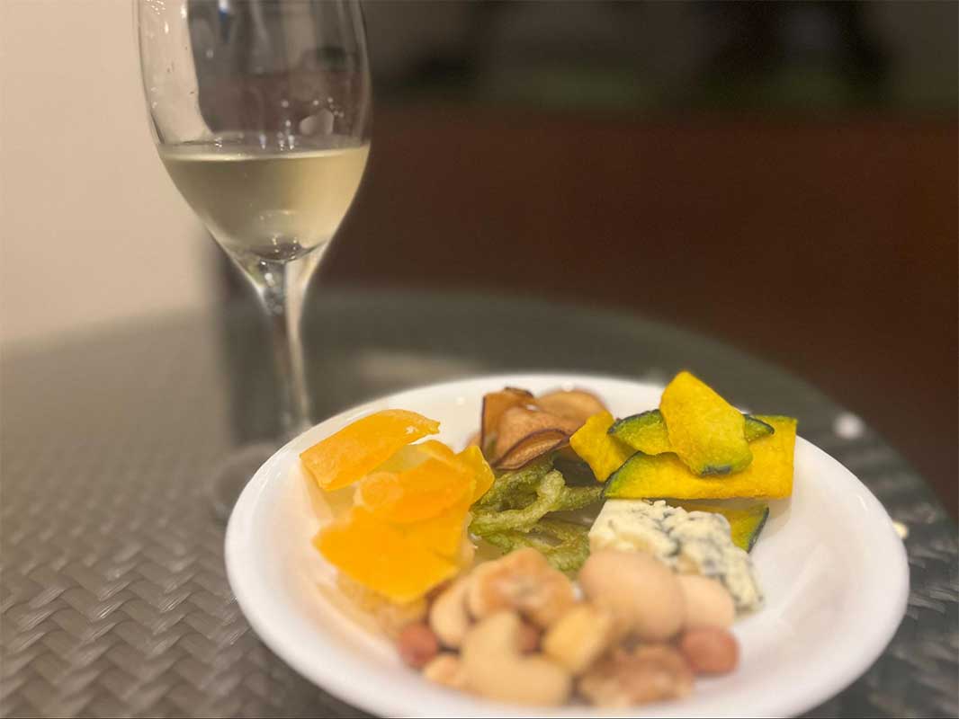 チーズや生ハム、野菜チップスなどの軽食が並び、ビールやワインとともに楽しめます。