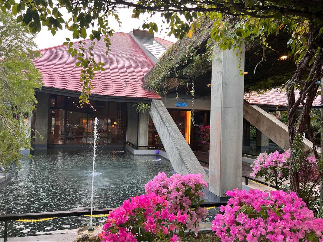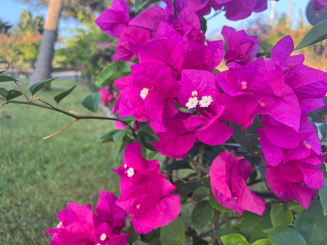 到着すると、エントランスには色鮮やかなブーゲンビリアと噴水が。南国リゾートらしい華やかな雰囲気に、気分が高まります。