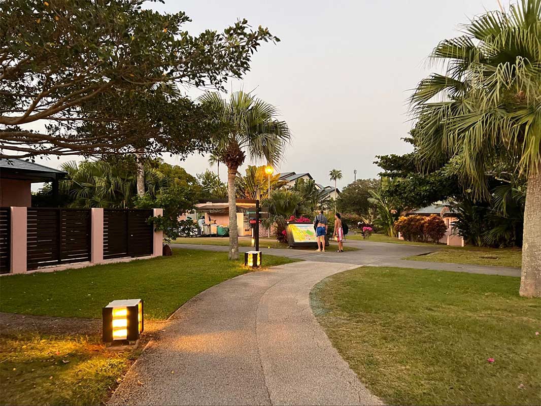 夕方になると、ヤシの木がライトアップされ、リゾート全体が幻想的な雰囲気に包まれます。