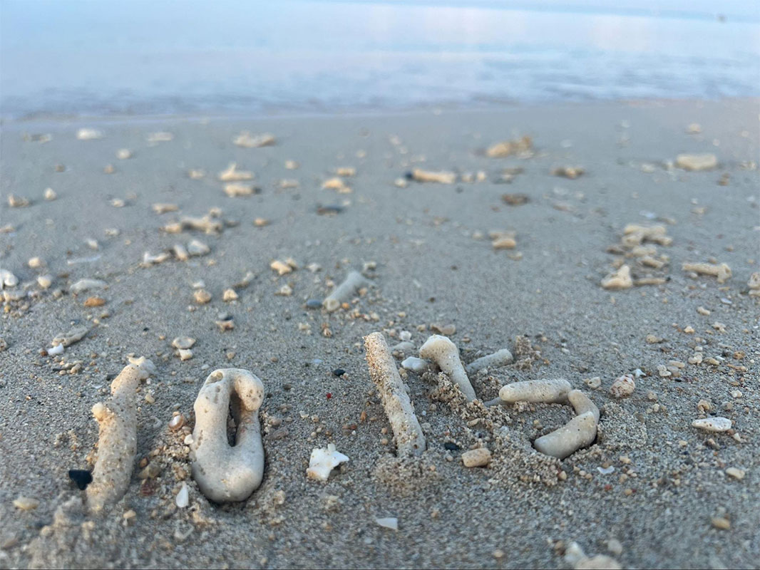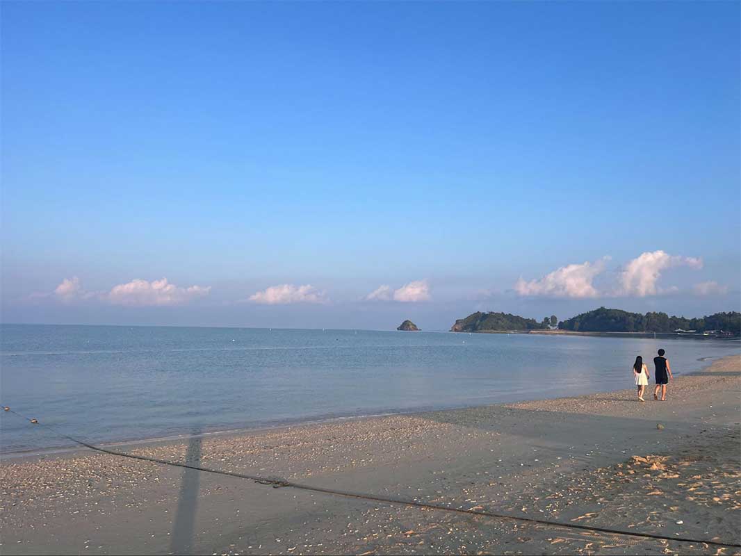翌朝は早起きして、淡いピンク色に染まるビーチを散歩。