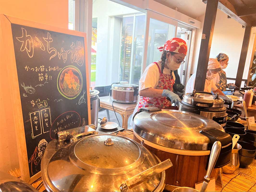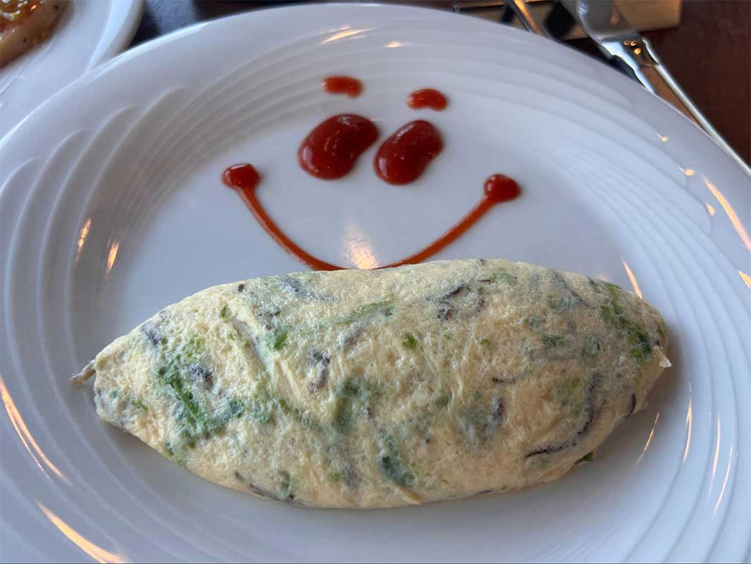 この日は県産もずくとあおさ入りで、ふわふわ食感のオムレツにケチャップアートが添えられ、朝から心が華やぎます。