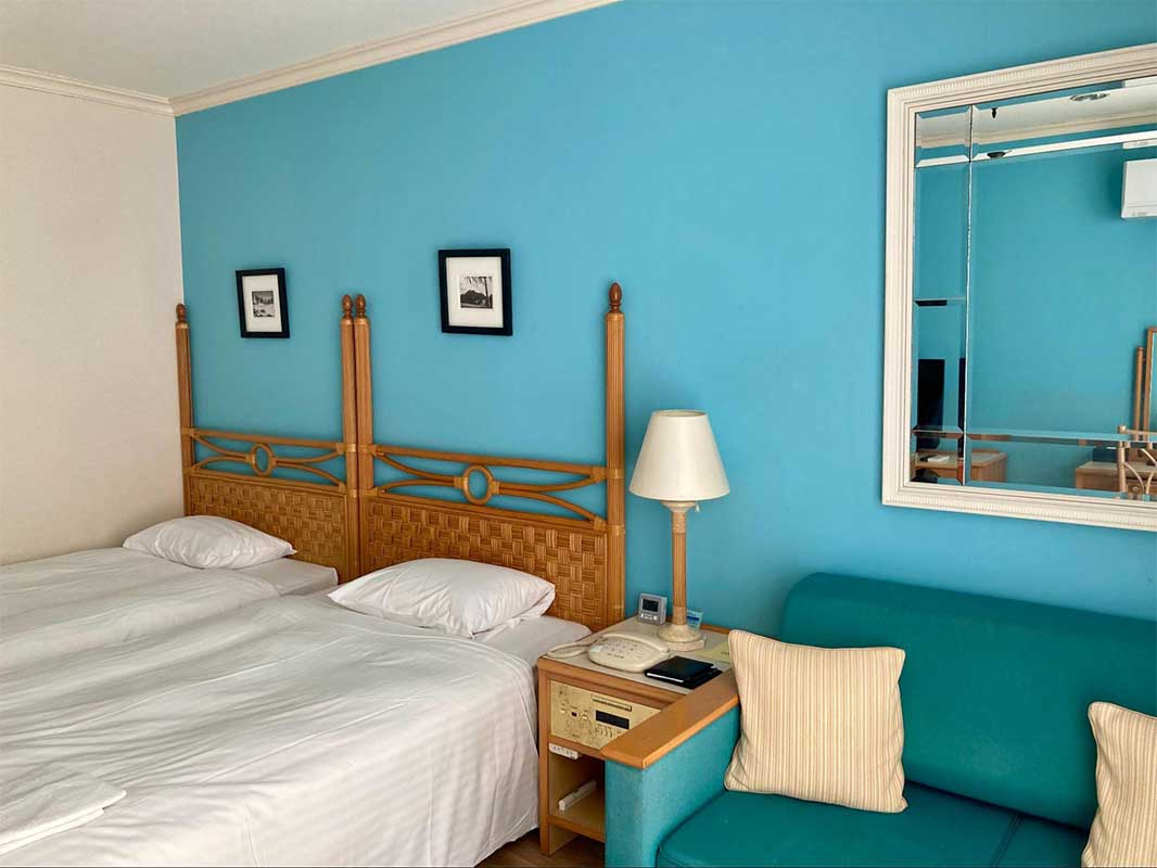 客室は全6タイプ。最初に友人と泊まったのは、パステルカラーの外観が可愛らしい「パームコテージ」。
