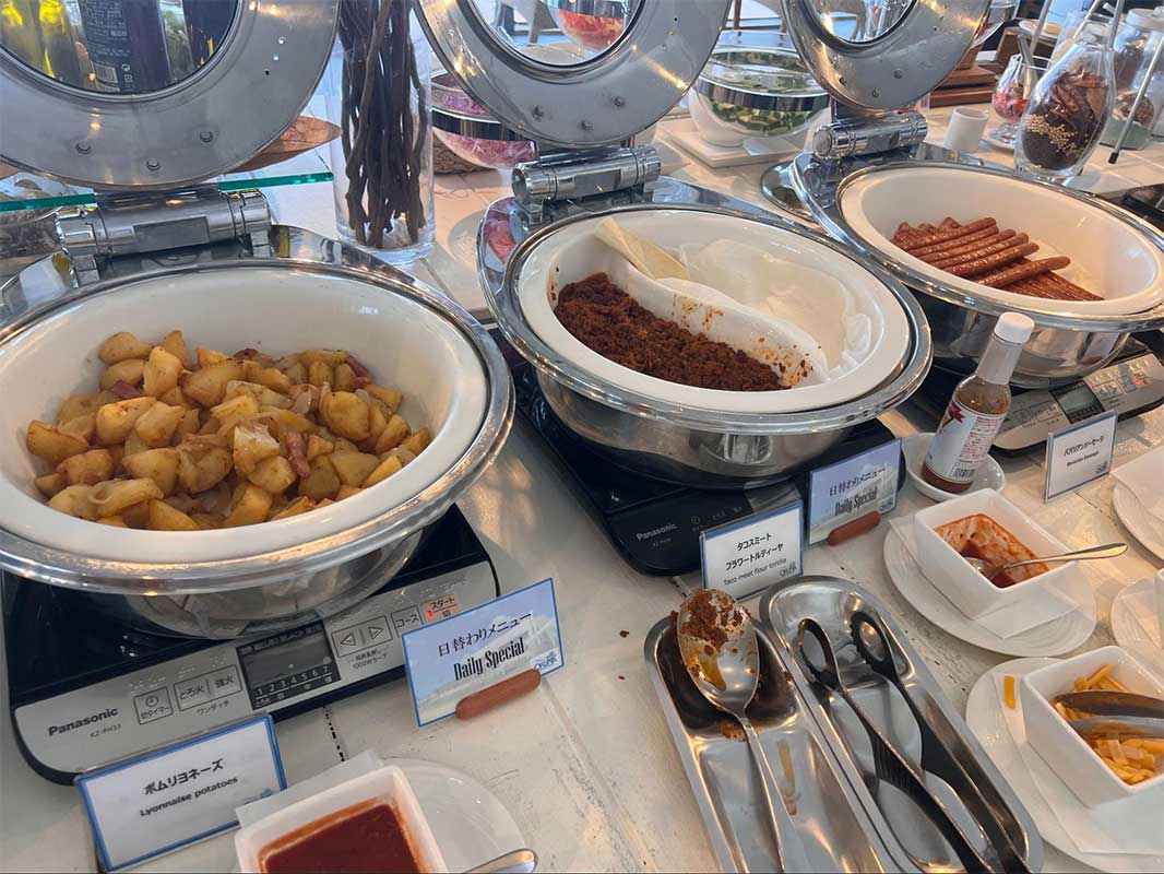 ポテトや肉料理、サラダ、パン、フルーツなど、普段はなかなか味わえない料理も並び、ついお皿をとりすぎてしまうほど。