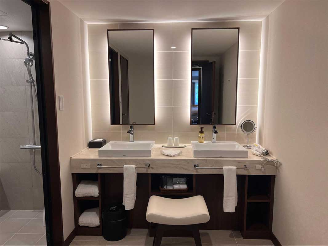 広々とした洗面台や清潔感のあるバスルーム。スキンケア用品からバスソルトまで、アメニティも充実しています。