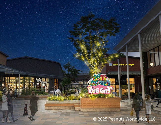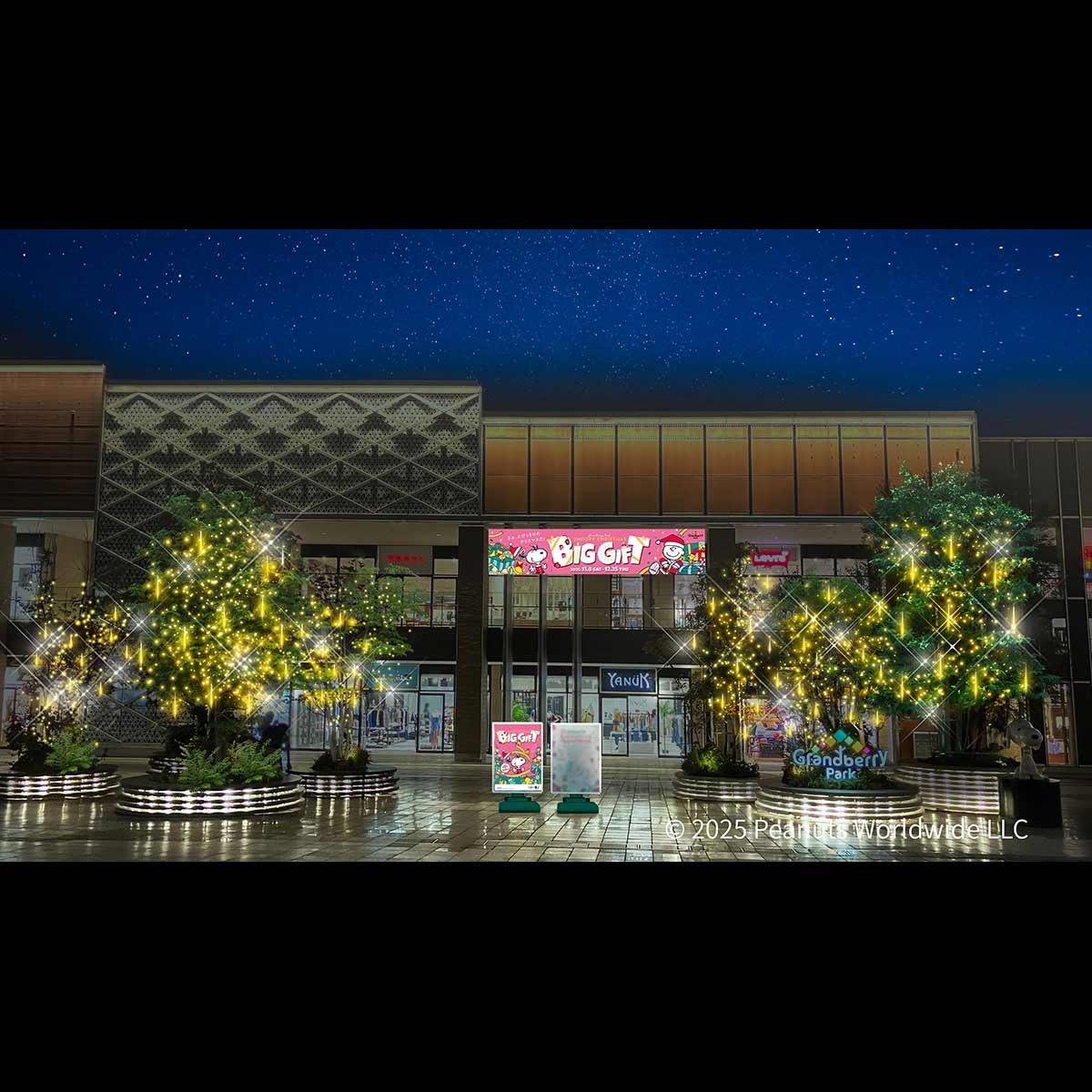 テーマは「BIG GIFT」で、巨大なリボンとプレゼントを飾ったクリスマスツリー、音楽と合わせたイルミネーション演出が登場する。スヌーピーと仲間たちのデザインが施設を彩り、華やかな気分になれるはず。