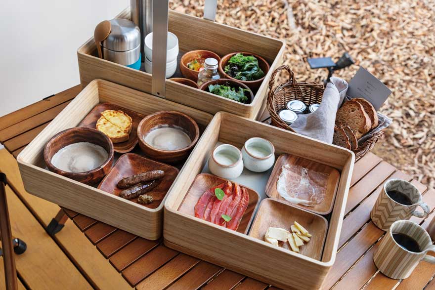 朝食(オプション)は、オリジナル家具をデザインする<アトリエヨクト>のオカモチに入れています。部屋や庭、好きな場所でどうぞ。