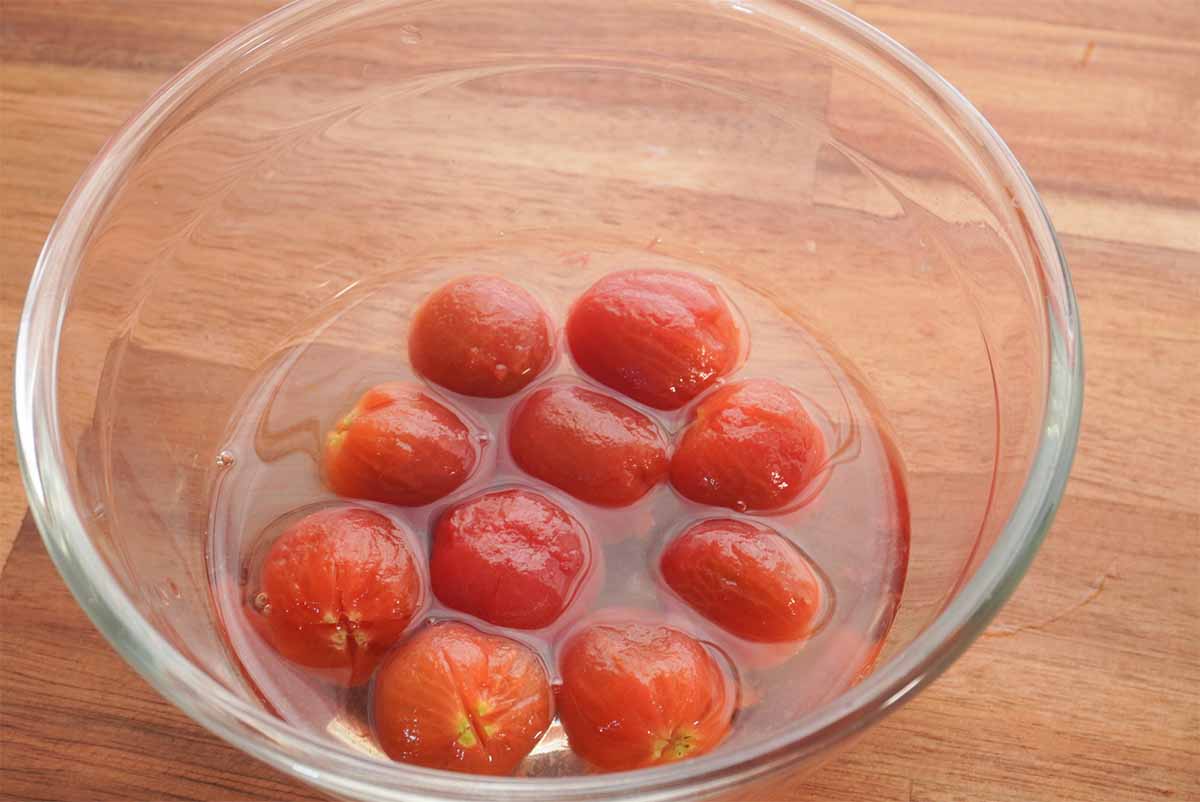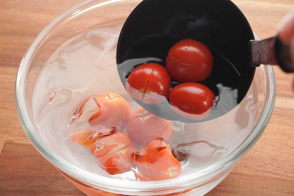 加熱したトマトを急激に冷やすとトマトの身が締まるため、むきやすくなります。水でも大丈夫ですができれば氷水で冷やした方がむきやすくきれいな仕上がりになります。