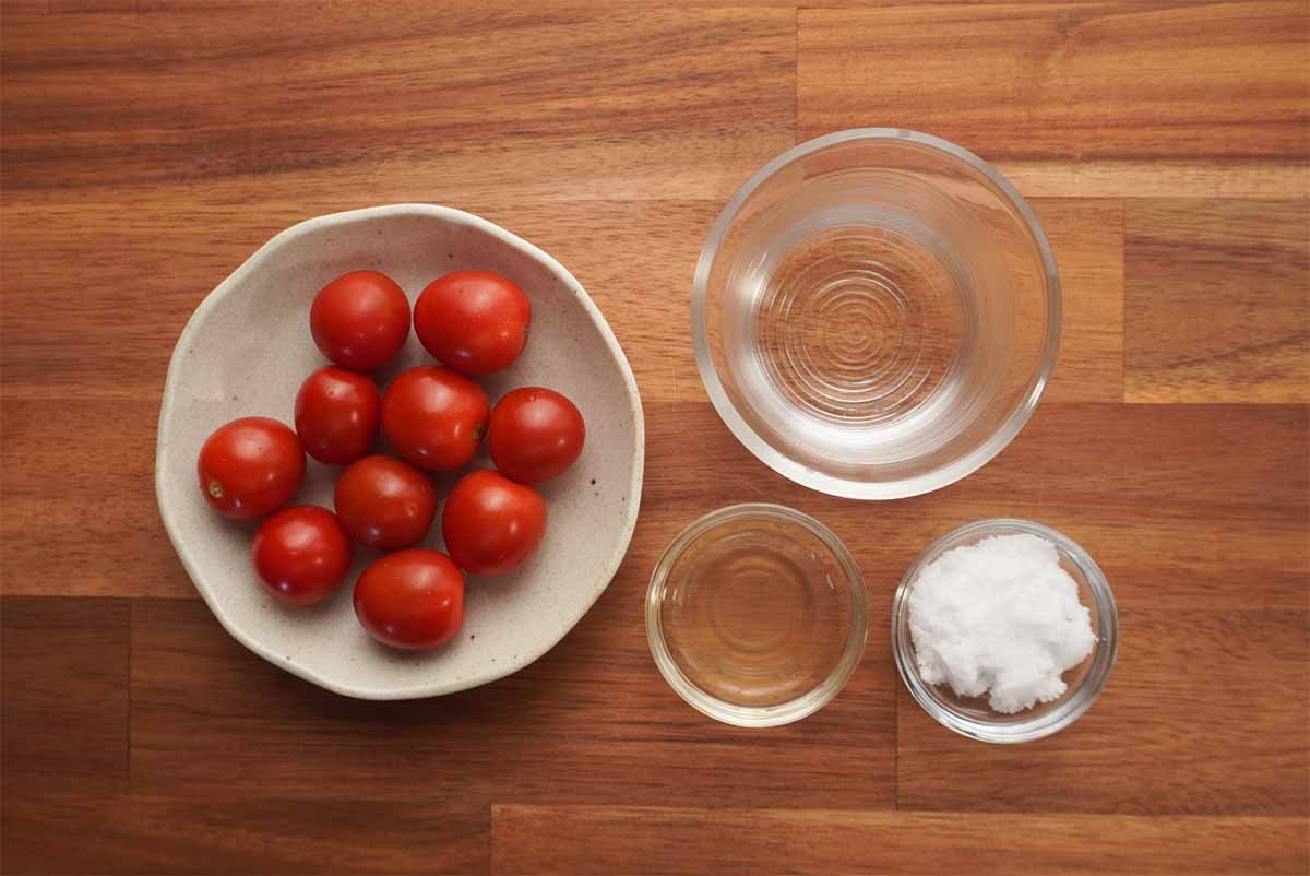 ④漬け汁にトマトを漬けて、お好みで冷蔵庫で1時間ほど冷やします。