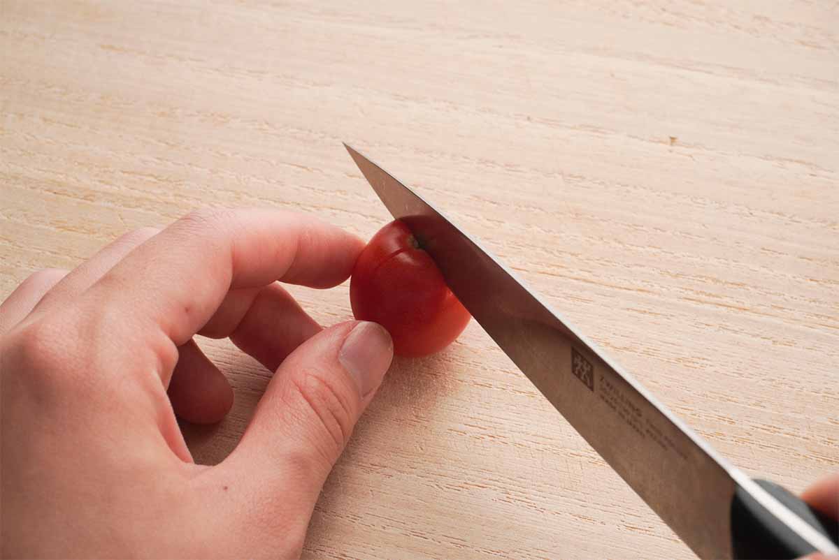 ①ミニトマトはへたを取り、十字に切り込みを入れます。