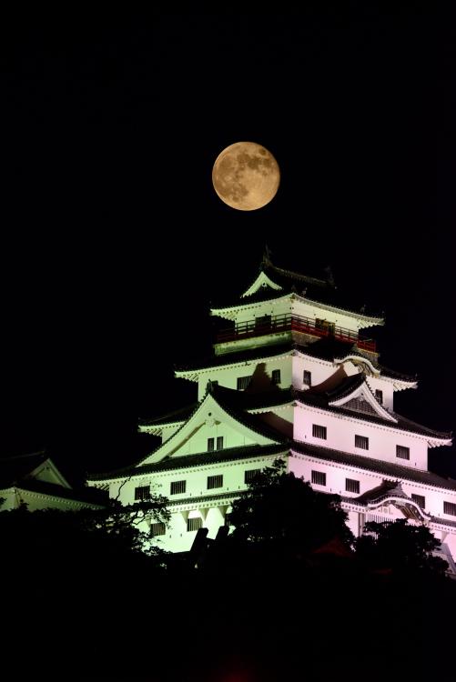 【‘25中秋の名月】ライトアップされた唐津城と月の幻想的な競演(佐賀県唐津市)