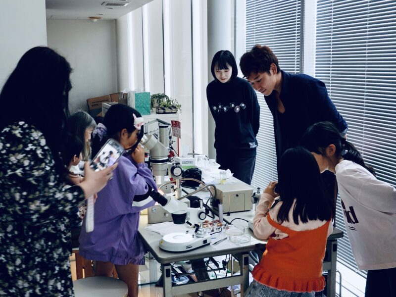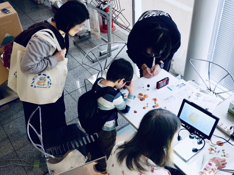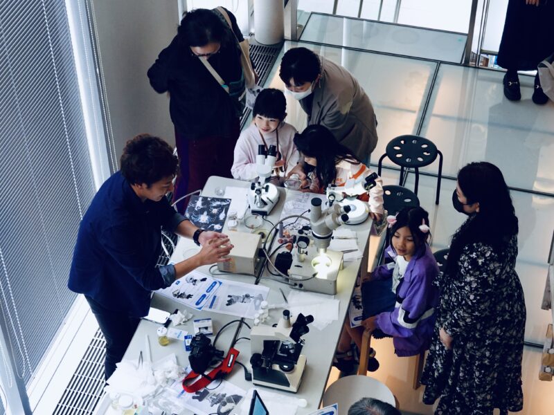 トークイベントに先立ち、でんかさんとむせきつい屋さんによる「顕微鏡ワークショップ」が行われ、子どもから大人まで10人ほどが参加しました。