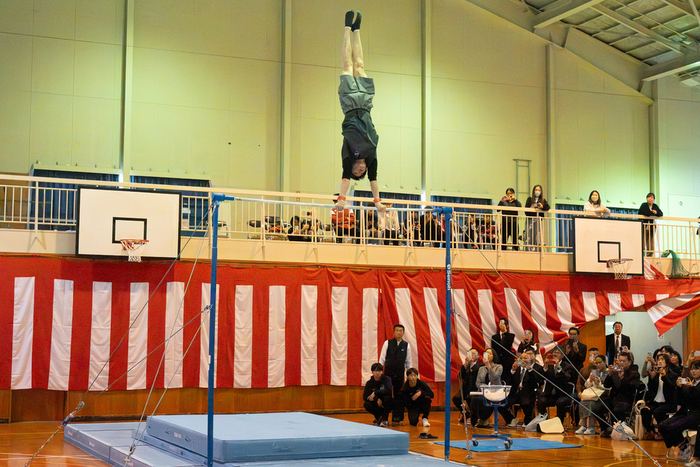 《画像:鉄棒の演技を披露し会場を沸かせた》
