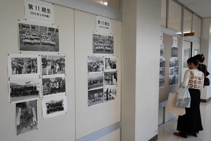 《画像:写真の掲示(上)や校舎見学(下)で思い出を振り返った》