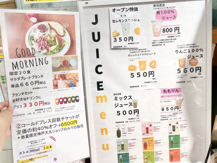 神戸店では、コールドプレスジュースを中心に、スムージーやサラダプレートを提供されています。