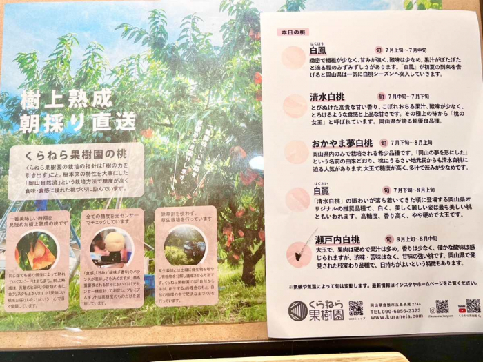 使用されている桃についてのこだわりもお伺いしました。岡山・倉敷にある契約農家『くらねら果樹園』から届くのは、“樹上熟成”というこだわりの栽培方法でとれた新鮮な桃。これは、ギリギリまで熟させる方法で、一番美味しい時期を見極めて収穫されるんだそう。