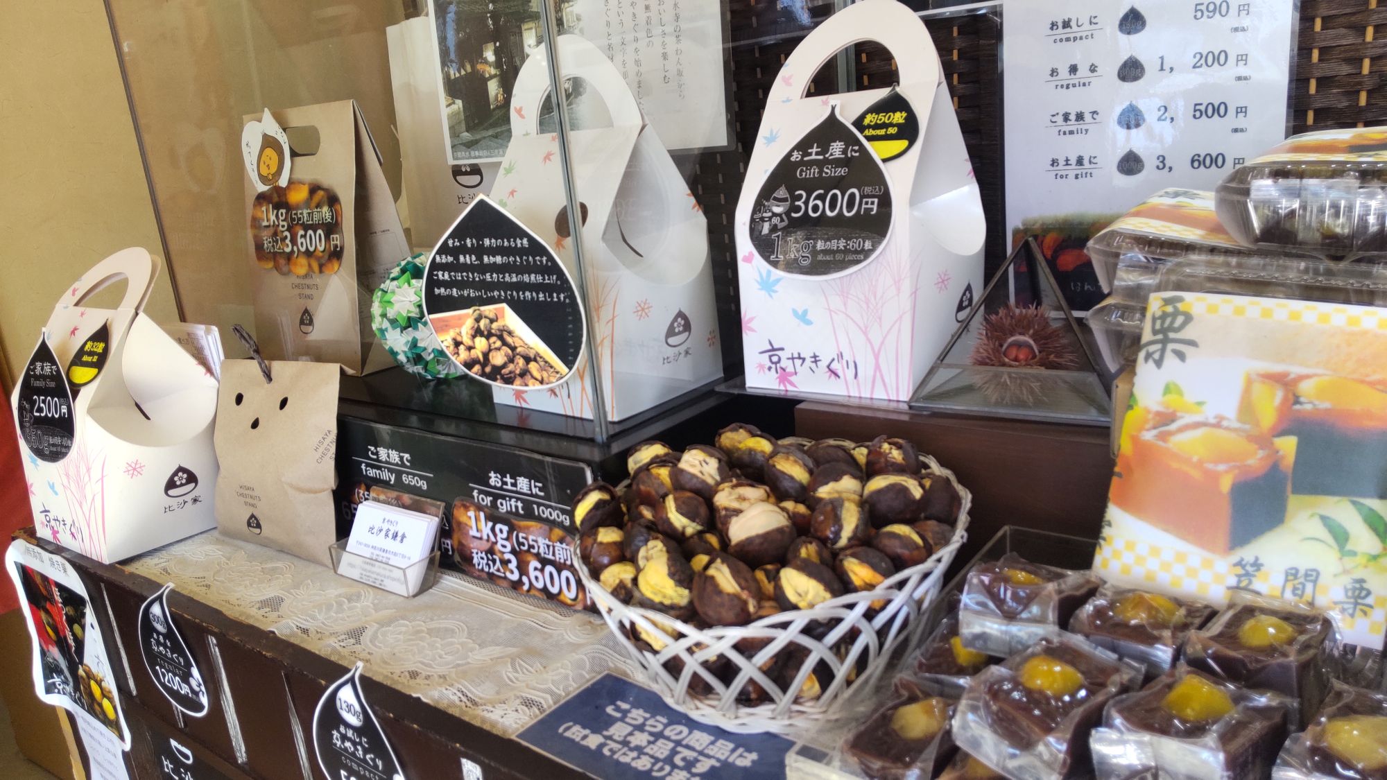 お店の前には栗のサンプルがゴロゴロ。筆者が訪問したのは初冬ですが、ちょうど新栗が入荷しているようです。右手には駐車場があるので、遠方の方も訪問しやすいでしょう。