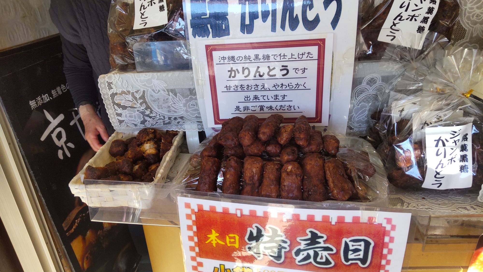 焼き栗のほかには、西表島の純黒糖で仕上げたジャンボかりんとうも。試食もあります。古都奈良で有名な「吉野葛」を使ったくず餅などは、手土産にもおすすめです。