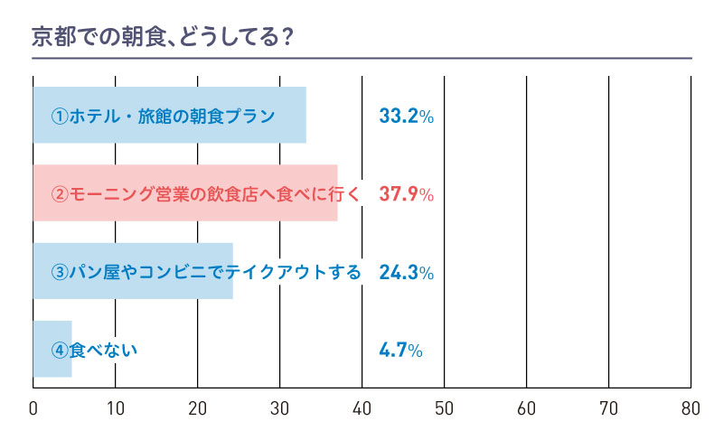 「モーニング営業の飲食店へ食べに行く」という方が最も多いですが、「ホテル・旅館の朝食プラン」や「パン屋やコンビニでのテイクアウト」をする方も見られました。喫茶店のモーニングや、美味しいパン屋さんが多いのは京都の特徴のひとつです。散歩がてらパン屋さんに立ち寄る方や、朝ラーメンを楽しむ方もいらっしゃいました。バラエティに富んだ朝食が楽しめることも京都の魅力ですね。