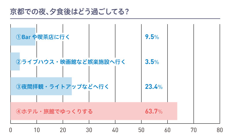 「ホテル・旅館でゆっくりする」が半数以上の結果になりました。朝から活動している方が多いので納得です。観光で疲れた体を休めて、明日に備える方が多いようです。京都には豊富な地下水を利用した銭湯も数多くあります。大きな湯舟に浸かって疲れを癒せます。