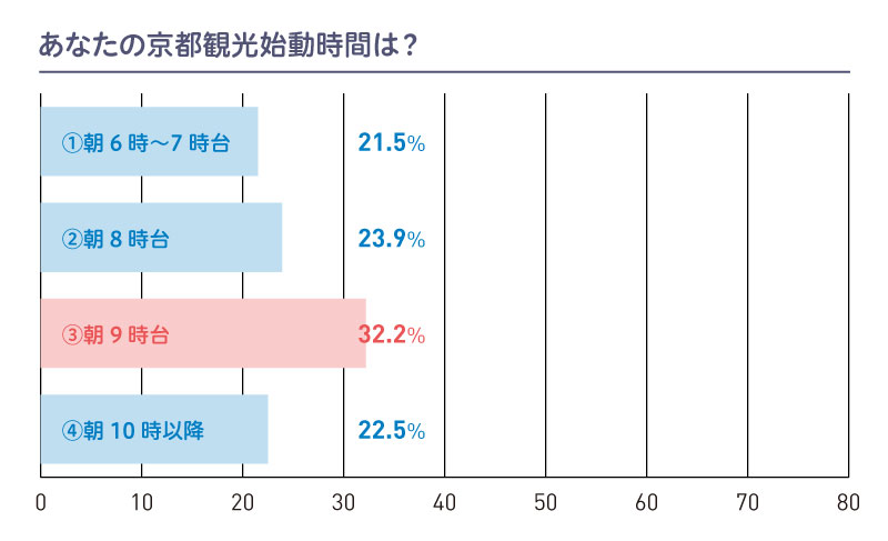 「朝9時台」から観光を始める方が一番多い結果となりました。さらに、6時~8時台に動き始める方が合わせて約45%を占め、京都ツウはかなり早い時間帯から観光を始めていることが分かります。朝のお勤めへの参列や散歩をしてからモーニングに行く方など、「朝飯前」に観光を楽しんでいることがわかりました。