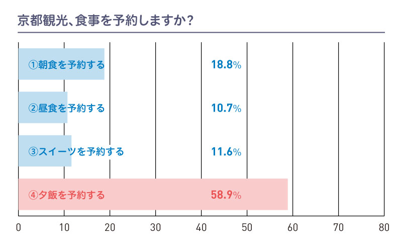 半数以上の方が夕食を予約していました。たっぷりと観光を楽しんだ後の夕食は、事前に席を確保しておけると安心です。また、「朝がゆ」など京都らしい朝食を予約するのもおすすめ。ゆったりと贅沢な時間が過ごせます。
