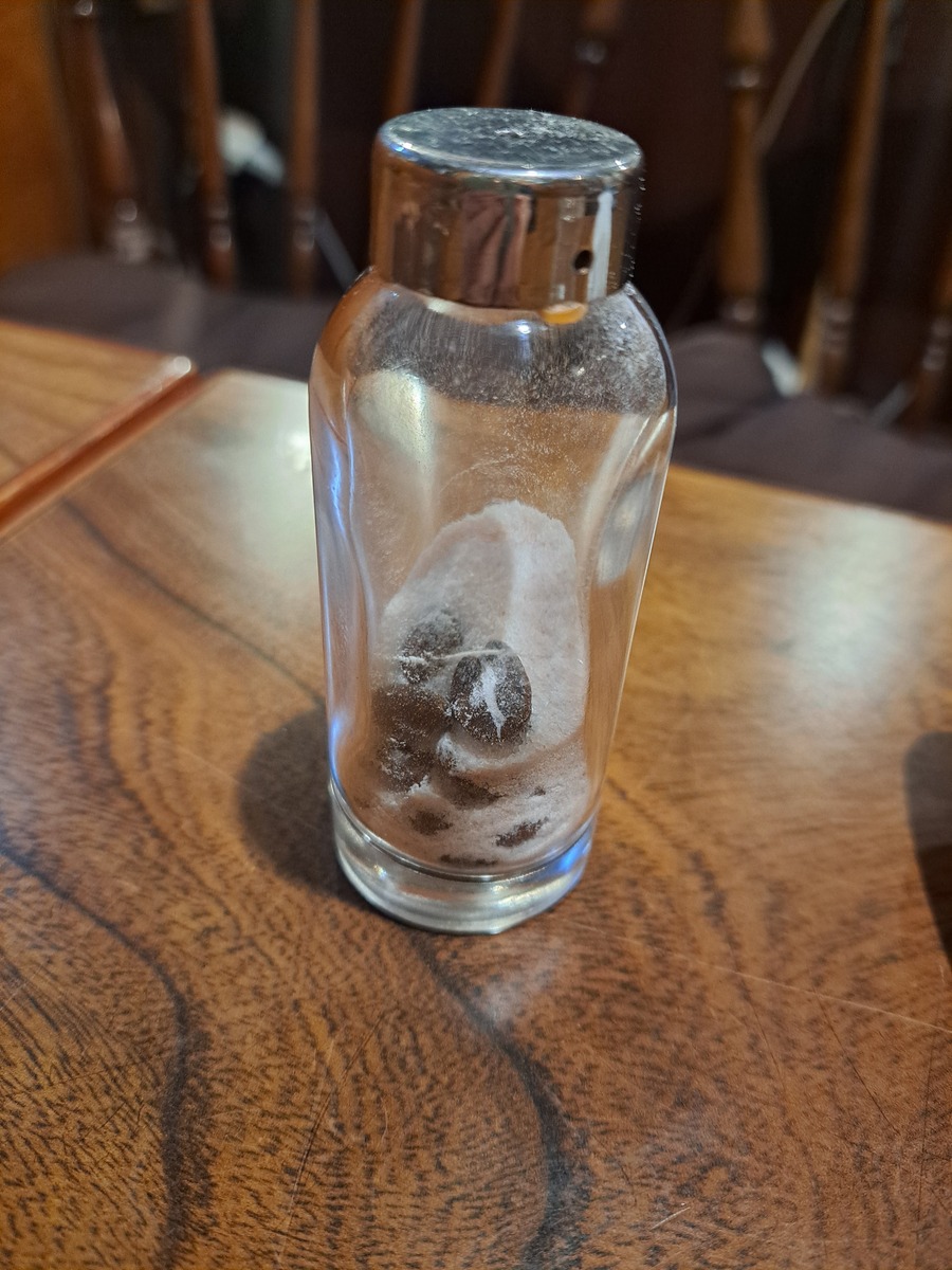 ピンク岩塩の中に、乾燥剤の代わりにコーヒー豆が入っています。