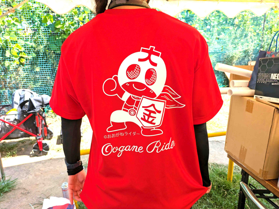 今回の祭りに向けて、ご当地キャラクターの「おおがねライダー」も考案。協賛店に配布するステッカーや実行委員会メンバーのTシャツにも描かれました。