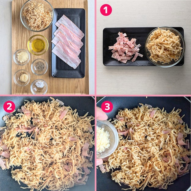 ② フライパンにオリーブオイルとおろしにんにくを入れて弱火で熱し、香りを出す。ハーフベーコンスライスを加えて炒め、切り干し大根を入れてさっと混ぜる。