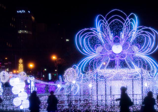 “Blooming Snow Fantasy”をテーマに、パーク内が光のお花畑に包まれます。たくさんの電球輝くライトトンネルや、土台をタッチすると色が変わるツリーなど、見どころ満載。白い花が光輝くハートのアーチには、ハート型の鍵をかけて愛を誓い合うことができるんだそう。