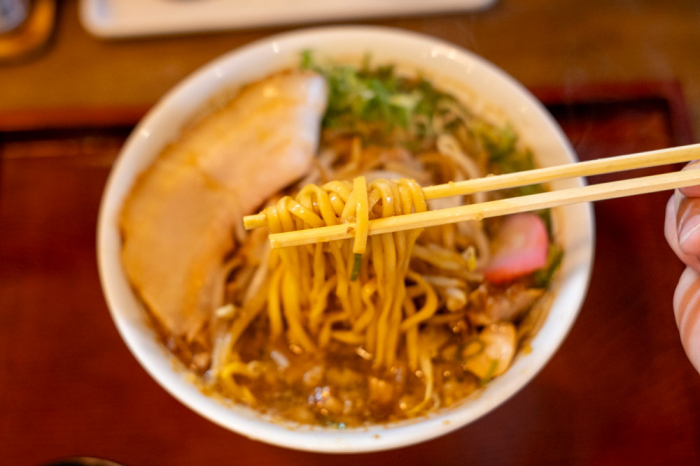 麺は平打ちの極太麺。「麺がしっかり美味しいことが大事」という思いから、小麦の上品な風味が味わえる一番粉を使用されています。