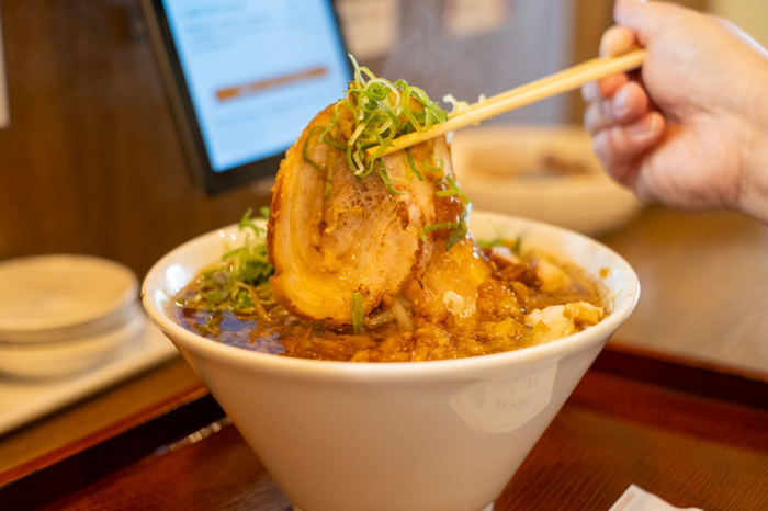 トッピングのチャーシューは、“手のひらサイズ”の炙りチャーシューと厚切りチャーシューの2種類。背脂・にんにくもマシマシで、着丼した瞬間、脳内の「二郎スイッチ」がオンになるのを感じました。