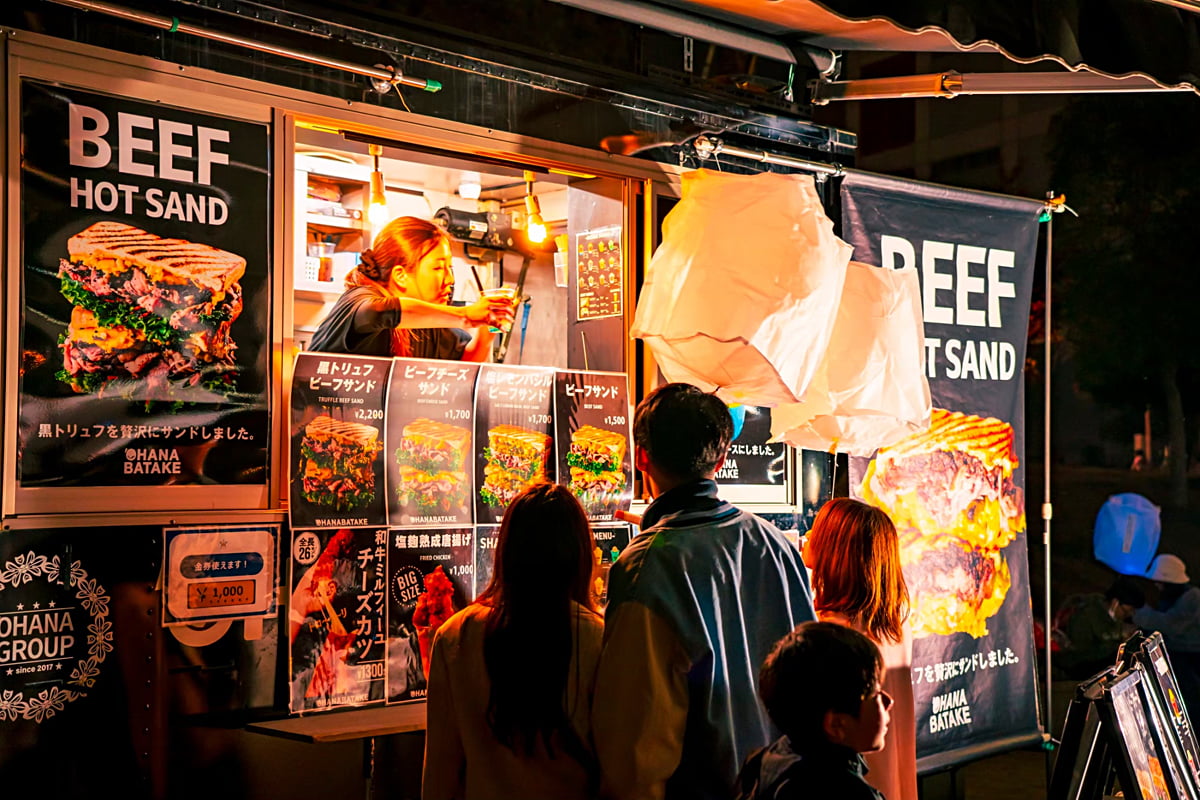 多彩なグルメが楽しめるフードトラックが出店。出来たてアツアツのグルメを味わいながら、夜空を彩るランタンの風景を楽しむ。秋の特別な夜を過ごせます。