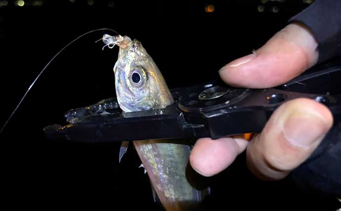 まずはアジングからスタート。ここはドン深なので、2g前後のジグヘッドに赤ラメのワームをセットしリグを目立たせながら、表層から順にレンジを探っていく。回遊待ちの構えをとるが、1時間が経過してもバイトらしき感触は皆無。水面にベイトの姿もほとんど確認できず、生命感が極めて乏しい。