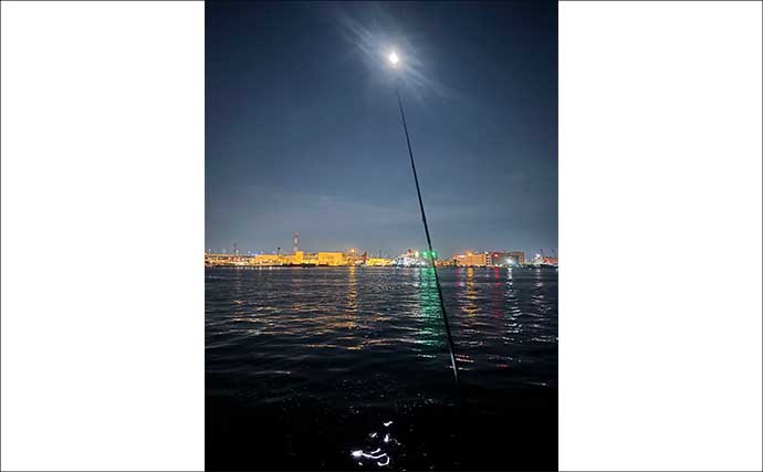 この日の潮は「大潮」。満月の夜であり、月明かりが強く、水面を白く照らしていた。一般的に、大潮は魚の活性が上がりやすい潮回りとされるが、満月との組み合わせは必ずしも好条件とは限らない。特に夜釣りにおいては、月明かりが強すぎると警戒心の強い魚がレンジを下げたり、ベイトが散ってしまう傾向もある。