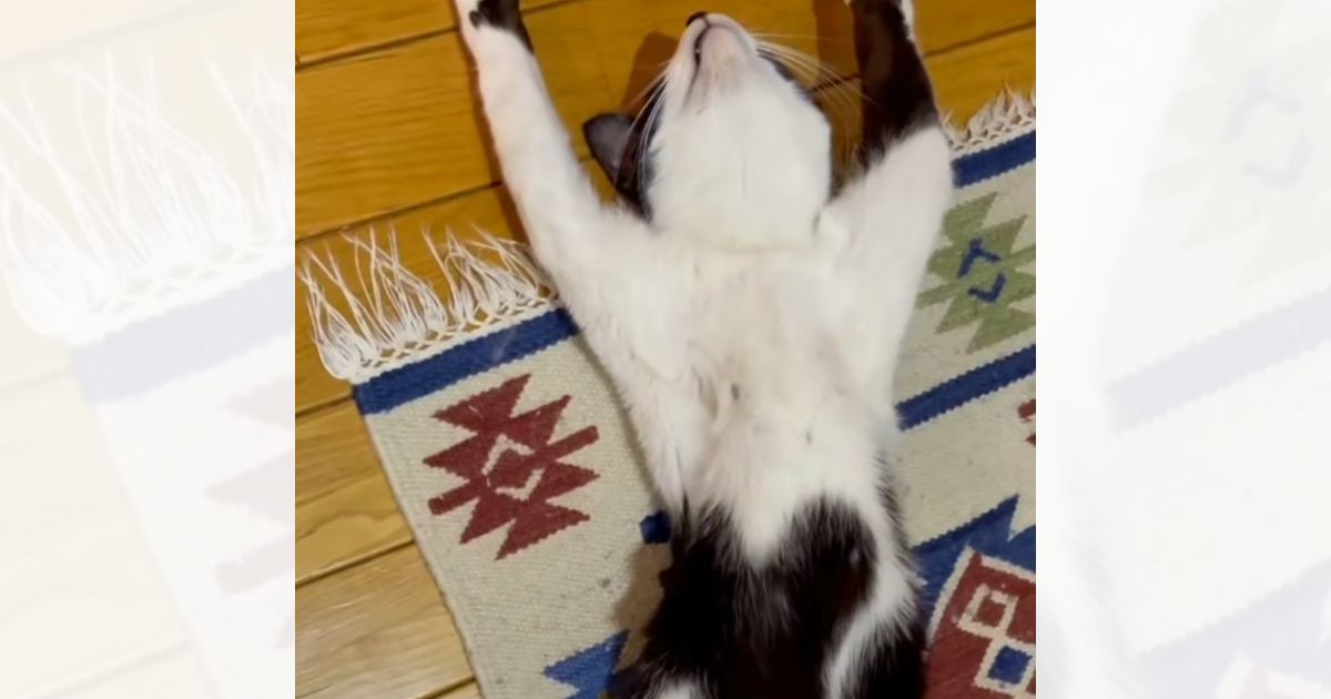 TikTokアカウント「りゅたろ」に、魚の開きのような格好で寝ていたハチワレ猫ちゃんが見せた、まさかの表情をとらえた動画が投稿されました。