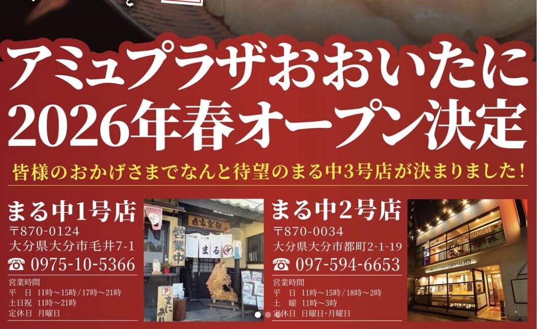 大分市毛井にある、人気つけ麺店『つけ麺らー麺まる中』が、アミュプラザおおいたに3号店を出店するそうです。
