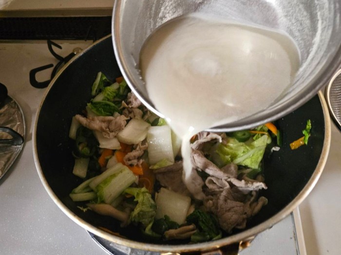 全体がしんなりしたら……水に溶いたパーポーを投入。