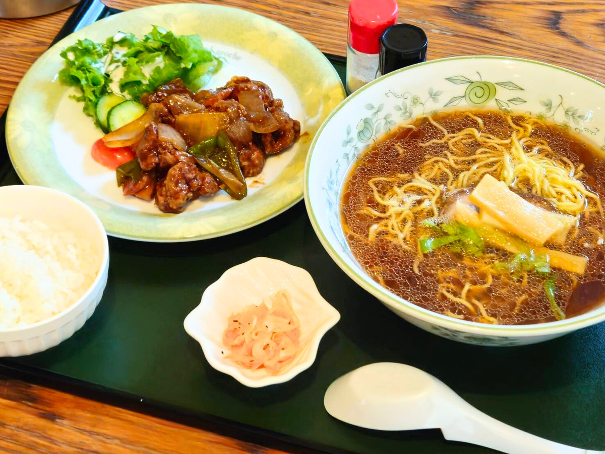 日替わりお肉料理、ラーメン、漬物、小ライスがセットになって税込1,000円以下という驚きの価格設定。