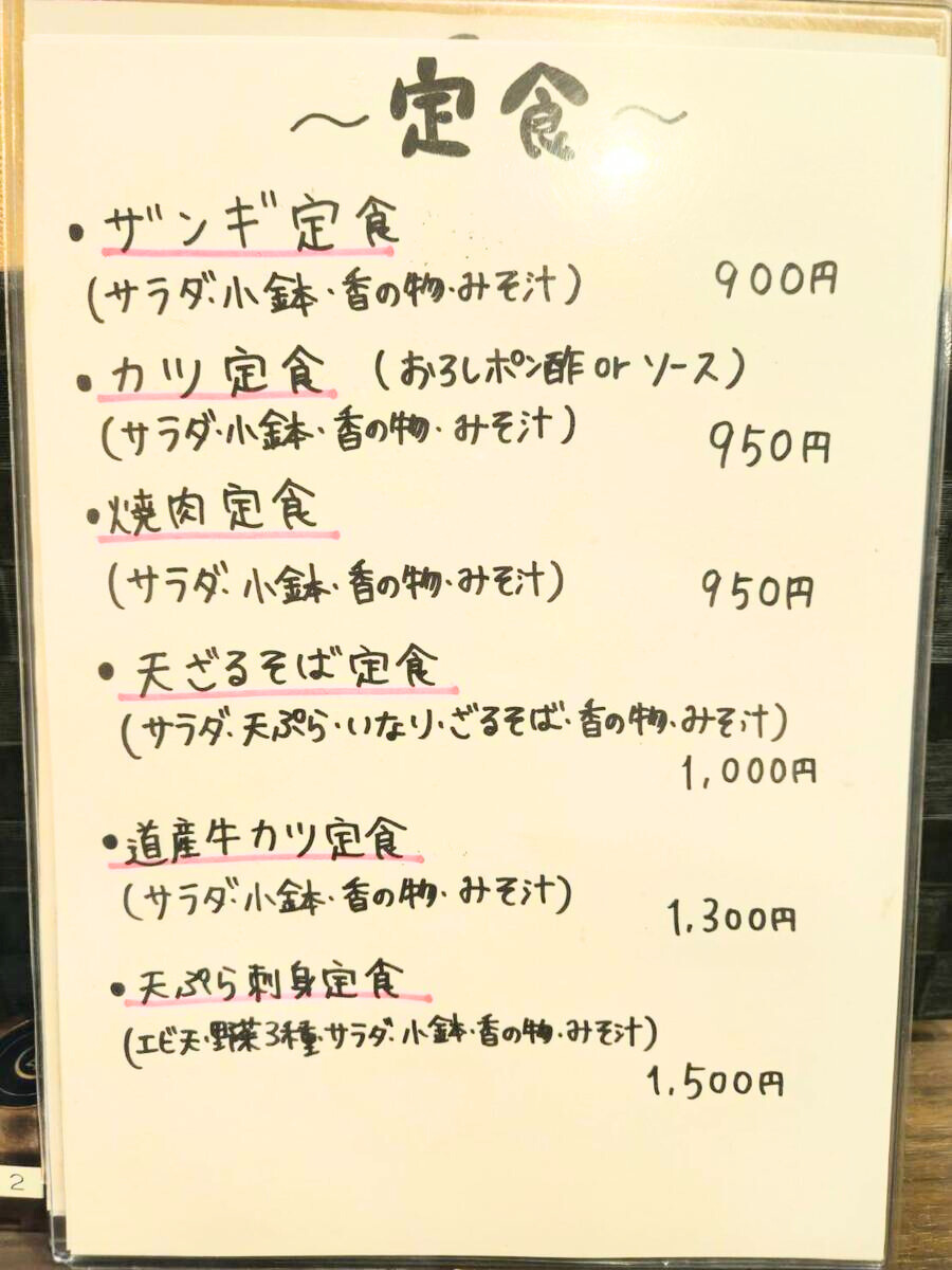 メニューはザンギ定食、カツ定食、焼肉定食などお肉メニューのほか、天ざるそばや、天ぷら刺身定食などもあり。