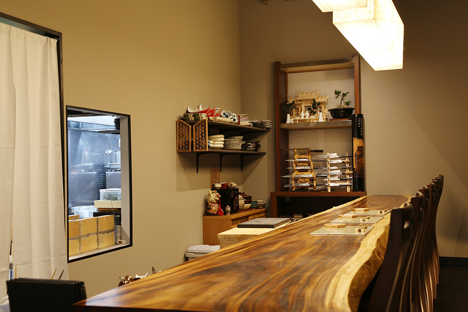 小山さん:自慢はカウンターです。「この木なんの木」っていう曲が流れるCMに映る「モンキーポッド」という樹の一枚板で、新潟県内ではうちにしかないんです。開店祝いにいただいたものですが、普通に買ったら100万円以上はするもので、木材に詳しい人は喜んでくださいます。