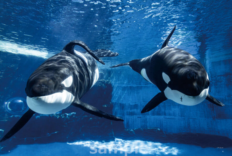日本一大きなシャチ「アース」と、名古屋生まれ「リン」の写真を大判サイズで楽しむことができます。