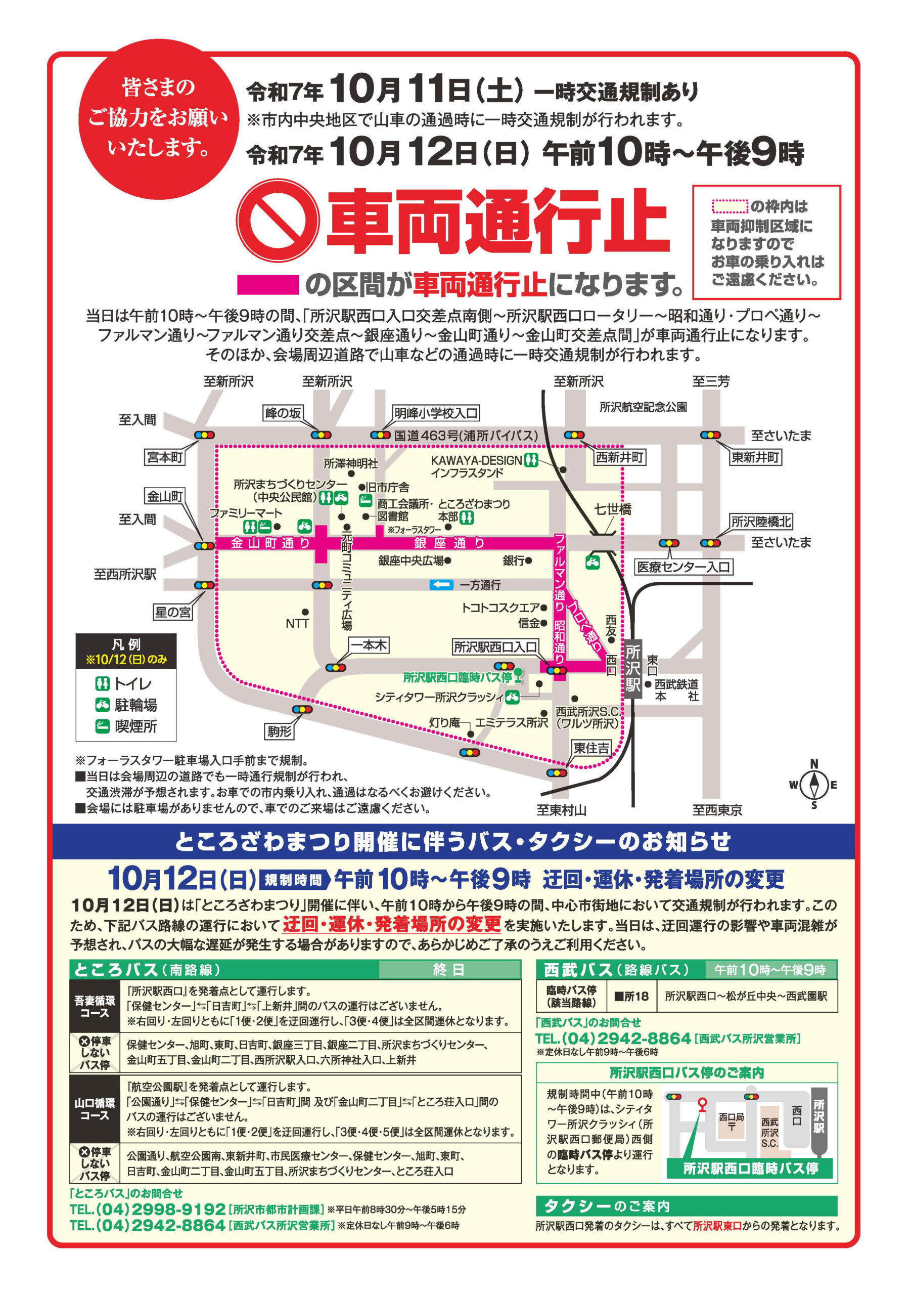 所沢駅西口入口交差点付近~所沢駅西口ロータリー~昭和通り・プロペ通り~ファルマン通り~ファルマン通り交差点~銀座通り~金山町通り~金山町交差点間、その他一部交通規制